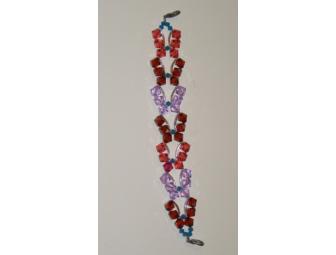 Sparkly Handcrafted Butterfly Tri-Color Bracelet 7.5" L x 1" W with a pewter color clasp closure. It has seven butterflies shaped in 3 different colored Swarovski multi-faceted crystal beads (3--amber; 2--rose; 2 amethyst). Each butterfly has six crystal beads plus one accent crystal. The butterfly bodies are made of silver and there are small turquoise crystal beads at the center of the body of each butterfly and at each end of the bracelet just before the clasp.