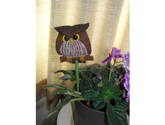 Handcarved and painted basswood owl plant stick by Nancy Curry. Owl is 3" wide by 3 1/2" long and sits on a dowel that goes into your planter. The Owl has detailed feathers.