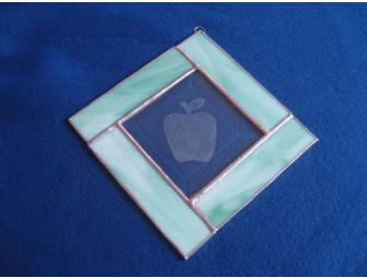 Wonderful 5" x 5" Handcrafted Stained Glass Sun Catcher with etched apple center motif and light green border.