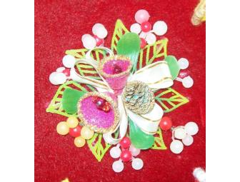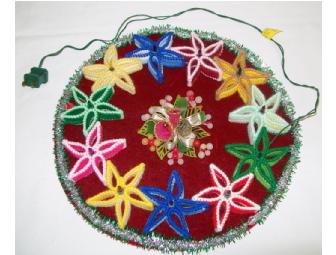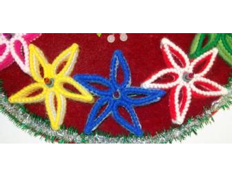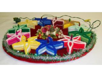 Retro Christmas decorations are making a comeback! Follow the trend with this vintage handmade holiday wreath. Multi-colored lights are embedded in knitted Poinsettia flowers that surround a red velvet background edged in green and silver tinsel. Plastic bells adorned with glitter rest in the center of the wreath alongside Holly berries.