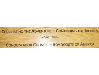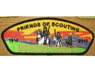 This plaque features five 2010 Friends of Scouting council shoulder strips from the Conquistador Council, Boy Scouts of America.