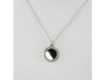 From Bachendorf's, a ladies 18 karat white gold, 15mm, engraveable disc set with 32 diamonds weighing a total of 0.18 carats.