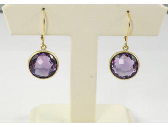 From Bachendorf's, ladies 18 karat yellow gold lever-back earrings set with two faceted amethysts.