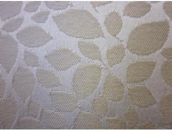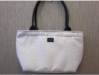Ivory leaf brocade with a chocolate gusset and hot pink lining; gysseted bottom in ivory "pony" fabric. black webbed rigid handle with a black nylon zipper. Two interior pockets.
