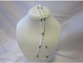Sophisticated fresh water pearl necklace with emerald-cut green aventurine beads. Features a silver hoop clasp. 27-1/2" long.