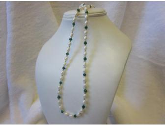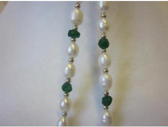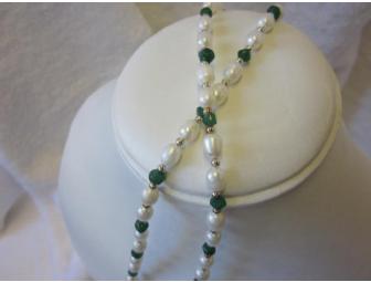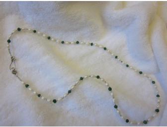 Fresh water pearl beads with gold tone and labordorite. Silver hoop clasp. 25-1/2" long.