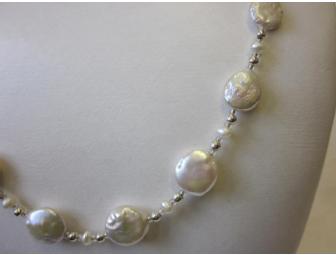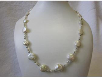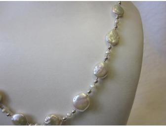 You will love this unique lentil (flat) freshwater pearl necklace with sterling silver and pearl beads and crystal spacers. 21" long.