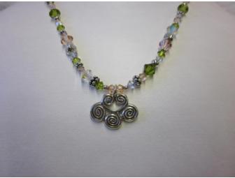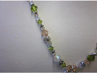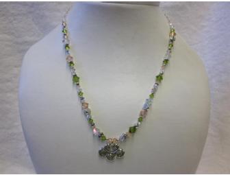 Sterling Silver and Swarovski crystal necklace with multipled shape silver spacers. Necklace is 17" long with a whimsical pendant.