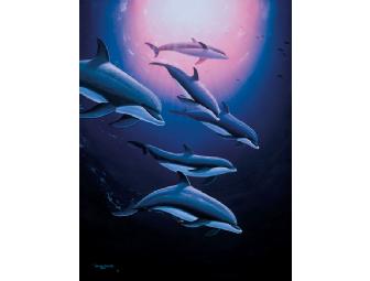 For millions of year dolphins have traveled in tribe-like families. This oil captures the unique dolphin persona as the light illuminates across their streamline bodies in a rare underwater encounter.