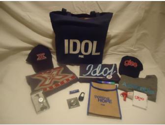 Enjoy this Idol Bag (Navy canvas bag with white lettering) filled with an Xfactor and Glee hat, House lip balm, American Idol hand sanitizer and pencil, Raising Hope lunch box, and Glee keychain and notepad.