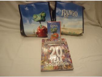 This set contains two cross body newsboy bags printed with Rango graphics, a hard cover collector coffee table book "Animation Magazine - 20 Years" and a DVD of Rango.
