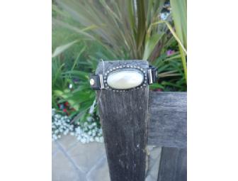 Leather bracelet with pearl and metal accents.
