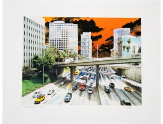 Color enhanced photograph of downtown L.Aa and the 101 Freeway. Overall measurement 11" x 8.5", white border.