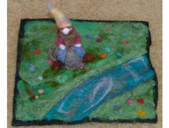 This Felted Gnome Soft Sculpture & Play Mat, created and donated by Village Home parent Lorilee Kopp of MamaKoppShop - Natural Toys for Natural Living, invites imaginative play. Soft to the touch, this little gnome rests on his soft stone, watching the sparkle-stream flow by....
