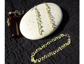 This hand crafted bracelet and earring set, with embellished glass holding jar, are made with green and yellow glass beads and silver coated wire.
