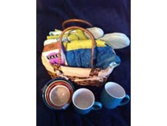 This kitchen basket contains the following: apron, oven mitt, 2 kitchen towels, 2 mugs, set of small nesting bowels, and a box of TAZO Passion tea.