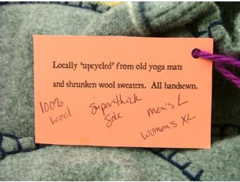 These cozy, comfy, non-slip slippers are locally 'upcycled' from old yoga mats and shrunken wool sweaters. The sole is made from a thoroughly washed, extra-thick old yoga mat, for non-slip grip. The upper and insole are made of shrunken wool, so the foot touches only warm, soft sweater. Elastic at the ankle provides a snug, comfortable fit. These slippers are completely handsewn.