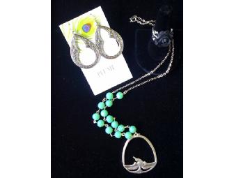 Adorn yourself with jewelry made right here in NE Portland! Fabulous silver pendant earrings, beaded bird pendant necklace, and filigree rose ring. All vintage style. Rachel Robichaud of Plume uses found object, vintage and reproduction cabochons, buttons and more to create her modern, eye catching and affordable every day wear jewelry. All metal is base metal. Earrings measure approximately 2 inches, necklace measures 20 inches + 2 inch pendant, ring size is adjustable. Wear it or give it!