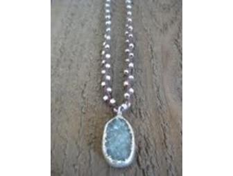 Enjoy this beautiful brown waxed linen and sterling silver braided necklace with sterling and agate druzy pendant. 18 inches. Made by Genevieve Broll.