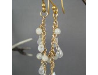 Enjoy these beautiful moonstone and 14k goldfill wire wrapped dangly earrings. Made by Genevieve Broll.