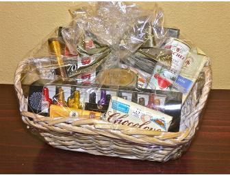 A large gift basket with an array of high end chocolates, including Theo, Chocolove, Valrhona, Toblerone, Venchi and Madecasse.