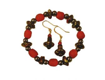 Set of matching bracelet and earrings, handmade from African beads. Beads are hand-made from recycled glass in Ghana.