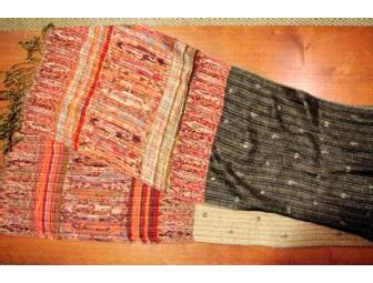 This beautiful, silky pashmina scarf is reversible and boasts brilliant red, blue, black, burgundy and green detailing. Depending on your mood, you can choose to show the side with lighter tones, or the side with darker tones. Dimensions: 72" length x 14" width.
