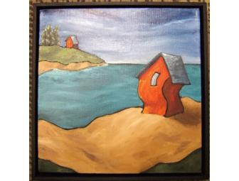 This piece, titled "Orange Beach House" by Jac Ouellette, is an oil on canvas measuring 12" long x 12" wide.