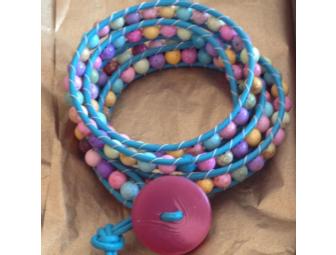 The latest fashion. A four wrap bracelet made from 6mm multi-color Howlite beads on tourquoise cow leather with a one inch designer button as a clasp.