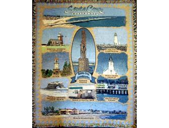 This beautiful, one of kind, blanket is lovingly woven with well known images of historic Santa Cruz Landmarks including Walton Lighthouse, Holy Cross Church, SC Beach Boardwalk, The Lighthouse Surfer Museum on West Cliff Drive plus many more. Dimensions are 68" x 52", feels warm but not too heavy. This 100% cotton blanket makes a great gift for anyone!