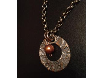 "Circle of Life" handcrafted bronze pendant with pearl and chain.