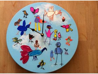 The kids have drawn birds that were decoupaged onto clock faces.
