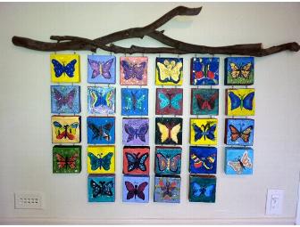 Students created butterfly wall collages of individual 3x3 canvas, painted by each child, of butterflies. Canvases were then hung from a branch.