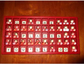Each inspirational wall hanging was made from old wood print trays, Scrabble or Bananagram tiles, and marbles. Small groups of fifth graders chose the saying, color and design of their box. They sanded the boxes, painted them, arranged the letters and marbles, and glued them.
