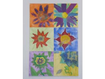 Each student completed a pastel drawing of flowers or leaves on a 5 x 5 inch art panel before apply a contrasting water color wash. Frameless art panels are matched in small groups of 3-5 pieces for bidding and ready to hang together or separately at home.