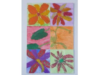 Each student completed a pastel drawing of flowers or leaves on a 5 x 5 inch art panel before apply a contrasting water color wash. Frameless art panels are matched in small groups of 3-5 pieces for bidding and ready to hang together or separately at home.