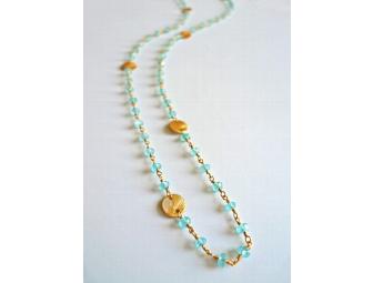 Kirsten is gorgeous! She radiates class and elegance at all times. Made with hand-wired apatite semi-precious stones and vermeil discs, this necklace measures 37 inches in length and can be double-looped and worn short.