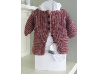 This Baby Surprise Jacket is made of hand-dyed superwash merino wool. It will fit a child approximately nine months to a year-and-a-half, as the sweater is very stretchy and the sleeves are designed to be worn at three-quarter length.