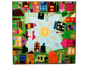 This vibrant quilt takes its theme from the kindergarten Social Studies curriculum of classroom and school communities. Each student drew a picture of his or her home and then cut out fabric to recreate their pictures for the quilt. Students did all the drawing, fabric selection and fabric cutting on their own with amazing and beautiful results. The background is a bright blue sky with rolling green hills and sequoia trees. In the center of all is the Sun, shining over the colorful homes and the palm tree that represents CDS. This beautiful keepsake depicts a happy, caring and supportive community of classmates, faculty, friends and family.
