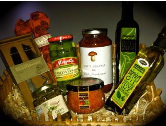 Includes Herb Flavored Dipping Oil, Capers in Vinegar, Extra Virgin Olive Oil, Wild Mushroom Marinara, Piquillo & Artichoke Bruschetta, Castelvetrano Whole Green Olives, a spreader & knife set, and 2 beautifully decorated cloth napkins with rings.