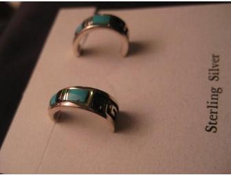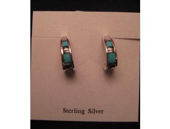 Sterling silver inlay miniature hoop earrings with turquoise, shell, and jet, and cast traditional design. Navajo made, from Anasazi Traders in Gallup, New Mexico.