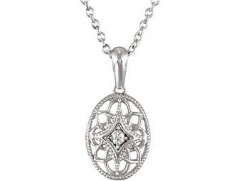 This is a fantastic necklace crafted in sterling silver and genuine diamonds! This oval pendant hangs from an 18” cable chain and boasts intricate filigree design. A lovely piece for every day wear! Gift box included.