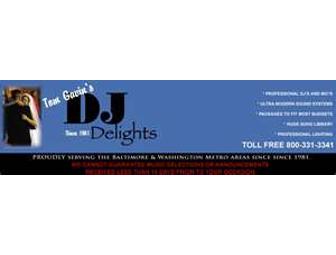 Four hours of musical entertainment by one of Tom Gavin's DJ Delights' professional disc jockeys. Since 1981 Tom Gavin and his team have been the preferred disc jockey service for thousands of weddings, parties, and celebrations. They are proud of their outstanding reputation and passion for event quality, affordability, and professionalism. Customize your music selections on their interactive website then sit back and let Tom Gavin's DJ Delights create a successful party.