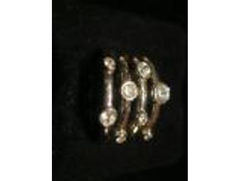 Large sterling silver ring set with 8 CZ stones of various sizes. This ring is fabulous on, and it is guaranteed to be noticed for its unique and striking setting. Heavy weight.
