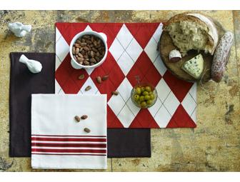 Spruce up any meal time with these sets of 6 placemats and napkins. Argyle placemats and Red Stripe napkins are made in 100% cotton twill. The placements reverse to solid Chocolate. Machine washable. Imported.