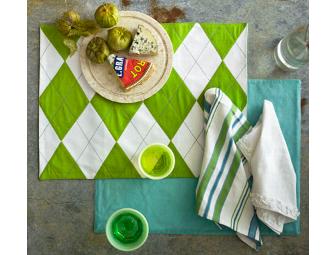 Spruce up any meal time with these sets of 6 placemats and napkins. Argyle placemats and Alana Cool napkins are made in 100% cotton twill. The placements reverse to solid Aqua. Machine washable. Imported.