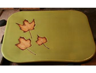 Alanna Hughes Handmade Ceramic Maple Leaf Platter. Bright green in color this platter can be hung on a wall as a decorative piece or used functionally for food. This unique one of a kind platter has real Truckee Maple leafs pressed into the pores of the clay and it is dishwasher and oven safe.