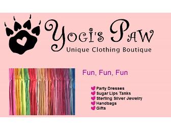 $30 gift card to Yogi's Paw in Mt. Kisco and a beautiful triple strand of crystal bracelet. Yogi's Paw is a clothing boutique that sells fun party dresses, jewelry, handbags, gifts, and more.