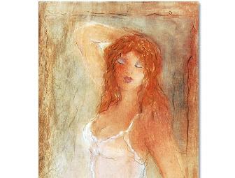Magal's simple calligraphic drawing of the female form or a flower-filled vase is the foundation of her personal style that she puts into her work. To these, the brilliant washes of lively colors act as a counterpoint, with the deeper and warmer hues evoking the luminosity of medieval stained-glass windows.