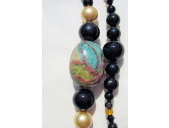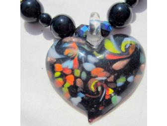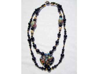 Double strands of REAL faceted and smooth Black Onyx; oodles of carats, with Austrian Crystal yellow pearls, hand painted art beads and blown art glass heart make a stunning fashion statement!